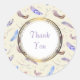 Un joli autocollant de remerciement. Un motif composé de plumes d'aquarelle avec des rayures, des taches et des motifs clairs et variés avec des couleurs bleu, rose, orange et marron. Branches et brindilles avec feuilles et bourgeons de saules de chatte décorent également le design. L'arrière - plan est de couleur crème solide. Un cercle avec une bordure en dégradé or et un centre blanc a les mots merci au milieu.
