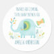 Cet autocollant de baby shower d'éléphant présente un joli éléphant qui souffle de l'eau de son coffre. L'éléphant est agrémenté d'un feuillage tropical vert et d'un papillon. Personnalisez-le avec la maman d'honneur nom sous l'éléphant. Conçu pour vous par Blackberry Boulevard.