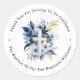 Autocollant moderne et élégant Merci Baptême. L'autocollant présente un arrangement floral bleu marine et or avec une croix bleu et or assorties, le tout dressé contre un arrière - plan blanc immaculé. Personnalisez davantage avec votre message de remerciement.
