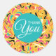 Une façon joyeuse d'ajouter un autocollant de remerciement à votre correspondance ou vos cadeaux, toute utilisation personnelle ou d'affaires va égayer avec ce jaune doré brillant et joyeux, orange, rose chaud, bleu turquoise et noir avec des accents blancs dans tourbillons jouants merci autocollant.