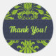 Un autocollant de Merci simple et élégant dans de riches teintes marines avec un vert vif dans un motif damassé rétro style.
