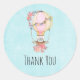 stickers Merci au design adorable avec illustration aquarelle. Une montgolfière ornée de jolies fleurs rouges et roses. Un mignon petit ours blanc est assis dans le panier. Arrière - plan bleu clair.