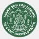 Merci d'être venu au camp sticker bachelorette avec un feu de camp, des montagnes et des arbres forestiers en vert et blanc.