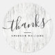 Élégant, classe, autocollants de remerciement avec texte personnalisable : "Merci" avec votre nom ou autre texte personnalisé ci-dessous sur un arrière - plan de grains de bois gris clair.