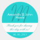 Autocollant initial simple blanc de Merci de faveur de mariage d'Aqua. Personnalisez vos faveurs de mariage avec cet autocollant élégant, simple, élégant de mariage avec un arrière - plan bleu turquoise d'aqua, les noms de jeunes mariés et l'initiale de monogramme avec le votre vous remercient message et date de mariage imprimés dans les polices élégantes des textes. Conception d'Elke Clarke©. C'est une grande manière de personnaliser vos faveurs de mariage.