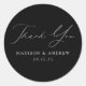 Élégant autocollant de mariage affichant "Merci" dans un magnifique script de calligraphie blanche avec un arrière - plan noir ou la couleur de votre choix. Personnalisez les autocollants de remerciement modernes avec vos noms et date mariage. Les autocollants de remerciement en mariage noir et blanc sont parfaits pour sceller les enveloppes de carte de remerciements, les sacs de faveur de mariage, etc.