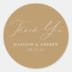 Élégant autocollant de mariage affichant "Merci" dans un magnifique script de calligraphie blanche avec un arrière - plan or ou la couleur de votre choix. Personnalisez les autocollants de remerciement modernes avec vos noms et date mariage. Les autocollants de remerciement du mariage d'or sont parfaits pour sceller les enveloppes de carte de remerciements, les sacs de faveur de mariage, etc.
