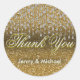 Un autocollant en forme ronde de remerciement aux couleurs or et argent.