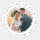 Cet autocollant de remerciement mariage présente des cadres en cercle gris avec une photo et une simple calligraphie.