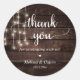 Merci pour fêter avec nous, autocollant rond mariage rustique, en bois rustique, lampes à cordes sur le thème.