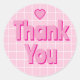 Merci autocollant avec texte rose croustillant avec une ombre portée rose plus foncé pour rendre les lettres pop. Un mignon petit coeur d'amour rose au-dessus du lettrage ajoute à la gentillesse. L'arrière - plan est rose clair avec un motif en grille blanche sur le dessus. Une façon simple mais douce de montrer votre gratitude.