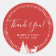Sticker rond Rustique Bois d'hiver Merci rouge classique. Joli cerf de bois d'hiver dans la neige avec des lampes à cordes et des pins.