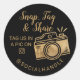 Le petit autocollant parfait à placer sur vos produits et aider à promouvoir votre entreprise. Notre design comporte une caméra vintage en faux or amusante. "Snap, Tag & Share" est conçu dans une police de style manuscrite. Ajoutez votre poignée sociale, afin que vos clients puissent vous aimer, étiqueter et vous partager sur les médias sociaux. OEuvre d'une caméra dessinée par Moodthology Papery.