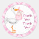 Design présente une cigogne portant deux adorables petites filles portant des arcs roses sur la tête, blotties dans une couverture rose. Il a les mots "Merci !" écrits deux fois en rose. Cet autocollant coordonne les annonces, les invitations pour les douches pour bébés et les timbres-poste trouvés dans mon magasin. Parfait pour ajouter cette touche finale en scellant l'enveloppe.