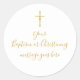 Avec une croix en or et une typographie à signature élégante. Personnalisez avec votre message spécial de baptême ou de christening sur cet autocollant élégant. Conçu par Thisisnotme