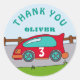 Mignonne voiture de course Red Boy Nom Age Anniversaire Merci Classic Round Sticker. Merci mignon autocollant avec une voiture de course rouge avec un nom, conduite sur la route. La voiture porte un numéro d'âge que vous pouvez changer. Ce design est fourni avec un Merci texte et un nom - personnalisez-le avec votre nom et votre âge.