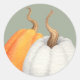 Un autocollant polyvalent pour la saison automnale, ce design mignon et polyvalent présente une paire de citrouilles orange et blanches sur un fond vert sauge uni. Vous pouvez changer la couleur de l'arrière-plan et ajouter votre propre texte personnalisé pour une fête ou un autre événement. Ces autocollants sont disponibles en 2 tailles : petite - diamètre 1 1/2 pouce, ou grand diamètre 3 pouces. La petite taille fait de jolis sceaux d'enveloppe ou pour ajouter aux sacs-cadeaux et paquets. Les plus grands autocollants de 3 pouces sont parfaits pour les cadeaux plus grands et les travaux manuels.