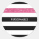 Personnalisez ces autocollants motifs modernes larges horizontaux noirs et blancs avec une bande de parties scintillant rose chaud en ajoutant le nom de toute fille fille. Ce motif à rayures graphiques tendance est parfait pour le fashionista chic. Image imprimée plate, PAS de parties scintillant réelle.