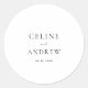 Le design de cet autocollant mariage est minimaliste et élégant. Il est agencé de façon circulaire et dispose d'un arrière - plan blanc propre. Le texte est centré et utilise une combinaison de polices serif et cursive pour créer un look sophistiqué. Les noms principaux sont écrits dans une police serif en majuscules et en gras, tandis que le mot de connexion entre eux est dans un style de script en minuscules délicat, ajoutant une touche de douceur. Sous les noms, une date est affichée dans une police sans-serif moderne. Le design général est simple et raffiné, mettant l'accent sur la clarté et le style intemporel.