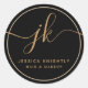 Sticker rond Monogram Custom Logo Business. Élégant autocollant d'entreprise ou étiquette de produit avec initiales monogrammes dans un script de calligraphie sophistiqué avec des swashes et votre texte personnalisé dans votre choix de toutes les couleurs (montré en or sur noir). MODIFICATIONS : Modifiez le style de police de texte, la couleur, la taille, l'espacement et le placement ou la couleur du cadre arrière - plan et circulaire dans EDIT pour coordonner avec votre marque. ASSISTANCE : Pour obtenir de l'aide sur la modification ou la personnalisation de la conception ou pour coordonner des éléments, contactez le concepteur AVANT LA COMMANDE via l'onglet MESSAGE Conversation Zazzle ou envoyez un courriel à makeitaboutyoustore@gmail.com.