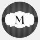 Cet autocollant rond présente un arrière - plan à rayures verticales noir et gris avec un cadre tourbillonnant blanc au centre. Le texte personnalisable vous permet d'ajouter votre monogramme.