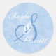 Cet autocollant bleu et blanc peut servir de sceau d'enveloppe pour vos invitations de mariage ou pour vos faveurs de mariage. Vous pouvez modifier la couleur du texte du monogramme ou les noms d'un autre aspect. Conseil de conception : Si vous changez l'initiale, vous devrez peut-être le recentrer.
