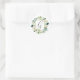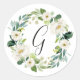 Autocollant Rond Classique Monogramme Couronne Fleurie Blanche présentant une couronne de feuillage vert aquarelle avec des fleurs blanches. Pour une personnalisation avancée de ce design, veuillez cliquer sur le bouton "Personnaliser". Des articles assortis sont également disponibles.