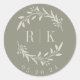 Autocollants monogrammes de mariage botanique sur mesure avec élégante couronne beige blanche avec initiales du couple et date mariage sur arrière - plan couleur sauge. Parfait pour le mariage, sauvez les dates, enveloppes, emballages de mariage et plus encore.