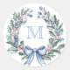 Cet autocollant de Noël a un design primitif et primitif avec un cadre saint avec une crête de monogramme bleu en haut. Vous pouvez personnaliser avec un monogramme.