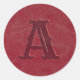 Cet autocollant rond rustique personnalisé présente un arrière - plan de texture en cuir faux rouge avec une initiale monogrammée que vous pouvez personnaliser. Conçu par un artiste de renommée mondiale ©Tim Coffey.