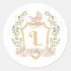 Ce joint d'enveloppe de faire-part douce pour bébé comporte une crête monogramme avec un chariot de bébé dans un jeu de couleurs neutres.