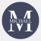 Cadeaux de monogramme et de nom personnalisés avec monogramme blanc personnalisé dans un style de police serif classique avec boîte de nom au milieu du monogramme sur fond bleu marine.