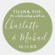 Moss signature verte de mariage faveur merci sticker rond classique avec des noms de style signature. Personnalisez avec vos informations de remerciement spéciales en typographie chic. Conçu par Thisisnotme©