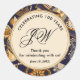 Élégant motif bleu et or 100e anniversaire merci autocollant pour les faveurs ou des notes de remerciement. Un motif bleu abstrait traditionnel fournit l'arrière - plan. Un cadre double or entoure un cercle clair bronzé qui contient le texte. Un monogramme de script chic est présenté au centre. Célébrer 100 ans est au-dessus du monogramme. Un message de remerciement et anniversaire est ci-dessous. Tout le texte peut être modifié.