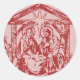 Scène nativité simple et élégant ornement de Noël, avec un arrière - plan moucheté rouge pâle avec un riche timbre rouge foncé de Marie, Joseph et bébé Jésus dans une petite crèche avec l'étoile brillante au-dessus d'eux.