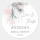 Neige en amour douche nuptiale d'hiver marques cadeaux merci les stickers, aquarelle rose pastel et gris branches de pin enneigé d'hiver avec cristaux guirlandes douche nuptiale d'hiver merci les stickers, police décontractée moderne