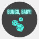 Les amateurs de Bunco s'unissent et se préparent pour la soirée de jeu ! Bunco, Baby! texte en aqua néon avec dés roulants correspondants a une sensation vintage / rétro
