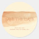 Un autocollant rond Save the Date comporte une bande de lavage à l'aquarelle orange classique avec un script élégant, parfait comme un joint d'enveloppe facile à lire pour les invitations et les rappels. Personnalisez avec les noms des mariés et des mariés et la date du mariage, ou utilisez pour les annonces de fiançailles reportées et les nouvelles notes de date "changer la date" dans les tons clairs et orange foncé correspondants. Le design moderne associe une typographie propre à un doux lave peint pour un look chaleureux et intemporel.