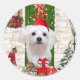 Chien maltais Noël assis à l'extérieur de la maison décorée avec la couronne de Noël, le sapin de Noël est une idée cadeau de Noël parfaite pour les amoureux de les chiens.