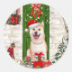 Shiba Inu Dog Noël assis à l'extérieur de la maison décorée avec la couronne de Noël, sapin de Noël est une idée cadeau de Noël parfait pour les amoureux de les chiens.