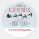 Autocollants de Noël festifs personnalisés. Un arrière - plan gris subtil avec des flocons de neige. Lettres tendance qui dit : Joyeux Noël et Bonne Année. Avec une Père Noël silhouette noire dans son traîneau tiré par son renne volant à travers le ciel.