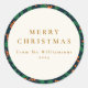 Sticker rond classique de Noël Holly Botanical Green Custom from Our Nom de famille en bleu marine, rouge et vert