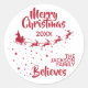 Montrez à quel point vous croyez à la magie de Noël et du Père Noël avec cet autocollant rond de la famille de Noël avec la silhouette de Père Noël traîneau en rouge avec ses rennes, volant dans une traînée d'étoiles. La légende sur le dessus lit Joyeux Noël en lettres manuscrites rouges festives. Le texte, dans une police rouge élégante, est facilement personnalisable avec vos souhaits, année, nom de famille ou nom d'entreprise. Cet autocollant fait le sceau de Noël parfait pour les souhaits de famille ou peut être utilisé pour décorer vos cadeaux de Noël