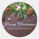Sceau autocollant de Noël personnalisé rustique avec des branches d'arbres de Noël festifs, des cônes de pin, des étoiles d'or et de la neige sur un arrière - plan de bois de campagne.Personnalisez avec le nom de famille pour le rendre spécial.