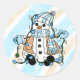 Mignonne bonhomme de neige à main tenant des lumières de Noël avec casquette mignon et mitaines en bleu et bronzé.