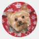 Yorkie, ou Yorkshire terrier, chien a joué dans l'emballage cadeau de vacances et de profiter pleinement de lui mignon autocollant de Noël