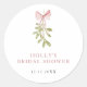 Célébrez la future mariée avec ce design minimaliste d'autocollant de mariage hivernal mettant en vedette une superbe illustration aquarelle de gui avec un nœud couleur rose poussiéreux doux.