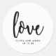 Élégant autocollant de mariage avec typographie noire moderne dressé contre un arrière - plan blanc.