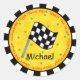 Vous trouverez de nombreuses utilisations pour cet autocollant rond comme un fan de course mère de toute sorte. Personnalisez avec votre nom ou d'autres mots ou félicitations - faites-le vous-même. Un drapeau à damiers blanc et noir brandissant est centré sur un arrière - plan jaune texturé et a une bordure à damiers noir et blanc. Les mots rouges autour de l'intérieur de la frontière et dire Race Fan, Commencez la course et à damiers drapeau. Les étoiles vertes sont sur l'arrière - plan. Idéal pour tous les types de course - automobile, motocyclette, vélo, derby et plus. Entièrement personnalisable pour une soirée sur mesure ou pour divertir pour montrer votre amour du sport. Personnalisable et coordonne avec d'autres accessoires pour une grande fête ou un événement.