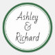 Sticker rond classique mariage vert foncé et blanc aux noms simples et élégants. Il affiche vos noms sur blanc avec une bordure verte. Il coordonne avec notre collection mariage "feuilles tropicaux verts".